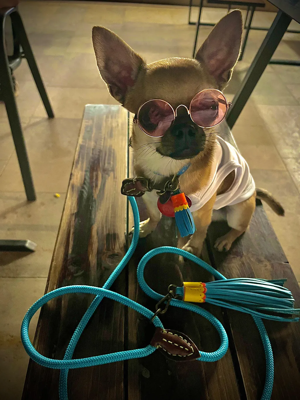 Die Boho Führleine "Lounge" von Dog with a Mission macht mit seiner Himmelsblauen Farbe der Leine und den gleichfarbigen Fransen jeden Sommer Look des 4Beiners komplett