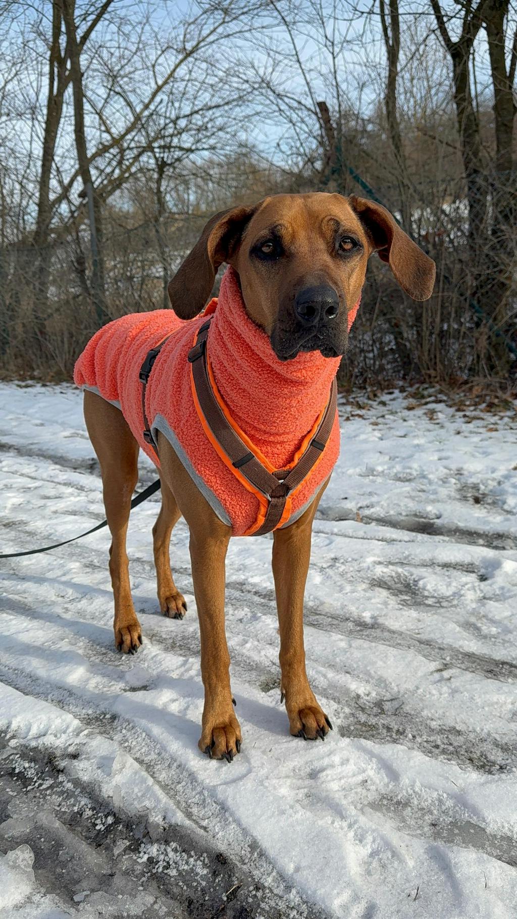 Besonders praktisch: Durch die leuchtende Farbe ist dein Hund auch bei trübem Wetter besser sichtbar – und bleibt dabei rundum kuschelig eingepackt. Ein Pullover, der Wärme schenkt, Wind abhält und dabei so aussieht, als käme er direkt aus einem Fashion-Shooting.